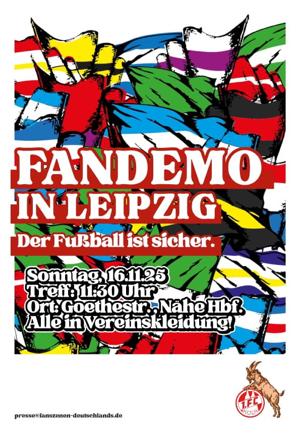 Wir rufen daher alle Fußballfans dazu auf, am Sonntag (16.11.) in Leipzig aufzuschlagen und dort lautstark für die deutsche Fankultur einzustehen. Der Treffpunkt für die Demonstration ist um 11:30 Uhr in der Leipziger Innenstadt. Genaue Infos folgen möglichst zeitnah.