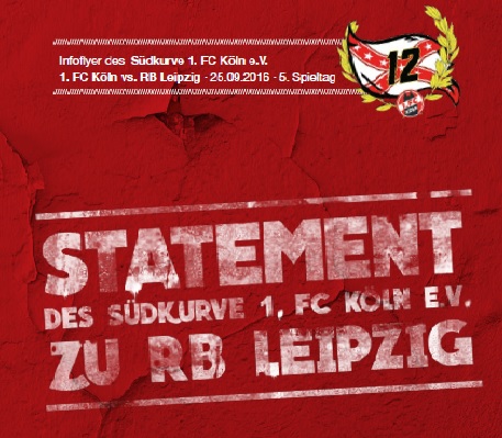 Damals entschieden wir uns gemeinsam mit allen Beteiligten den Auswärtsspielen fern zu bleiben und bei den Heimspielen präsent zu sein. So werden wir kommenden Sonntag unsere Mannschaft gegen Leipzig selbstverständlich lautstark unterstützen. Um zu zeigen, dass es sich aufgrund des Gegners nicht um einen normalen Spieltag handelt, werden wir analog zu den letzten Heimspielen gegen RB Leipzig auf jegliche optische Unterstützung verzichten. Dieser Verzicht beinhaltet neben Fahnen, Doppelhaltern auch die Zaunfahnen unserer Fanclubs. Stattdessen wird am Zaun der Südkurve ein gemeinsames Banner platziert, um unseren Standpunkt deutlich zu machen. Dieses Vorgehen wurde damals für alle Heimspiele gegen RB Leipzig festgelegt, um möglichst nachhaltig vorzugehen. Darüber hinaus bitten wir alle FC-Fans sich mit dem Thema kritisch auseinander zu setzen und die Meinungen durch Spruchbänder ins Stadion zu transportieren. Fragen oder Anregungen: info@suedkurve.koeln oder am Spieltag an den Ständen hinter der Südkurve.